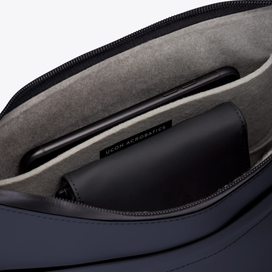 Caractéristiques pratiques : poche frontale à fermeture magnétique, compartiment principal avec glissière résistante à l’eau, poche intérieure en feutre doux pour téléphone, sangles réglables.