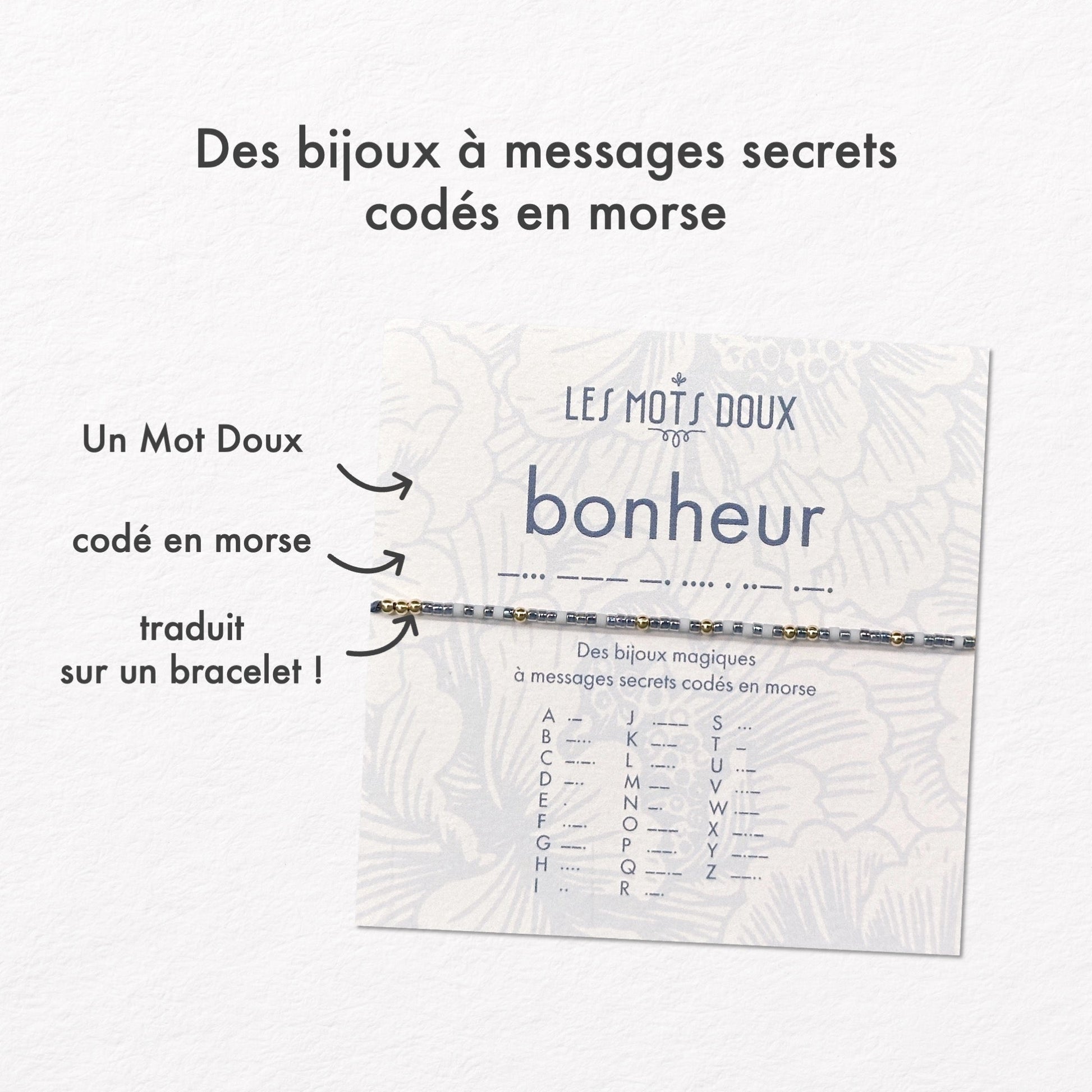 Les perles reprennent le code de l’alphabet morse pour traduire un message secret dont vous seule connaissez la signification. Ici : Bonheur