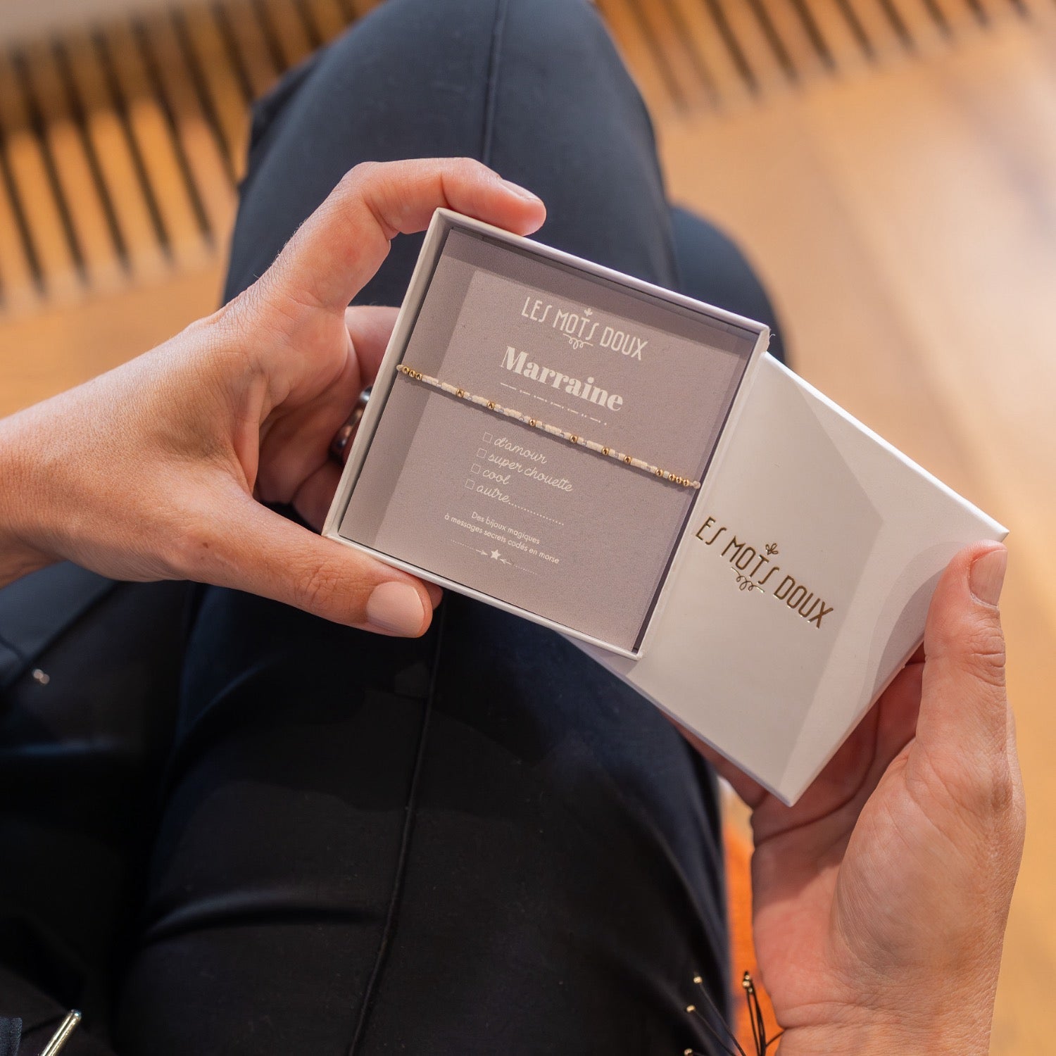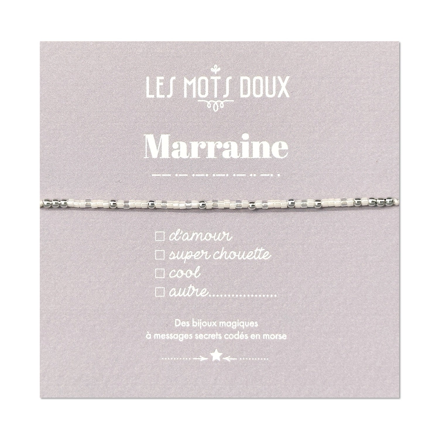 Les perles reprennent le code de l’alphabet morse pour traduire un message secret dont vous seule connaissez la signification. Ici : Marraine.