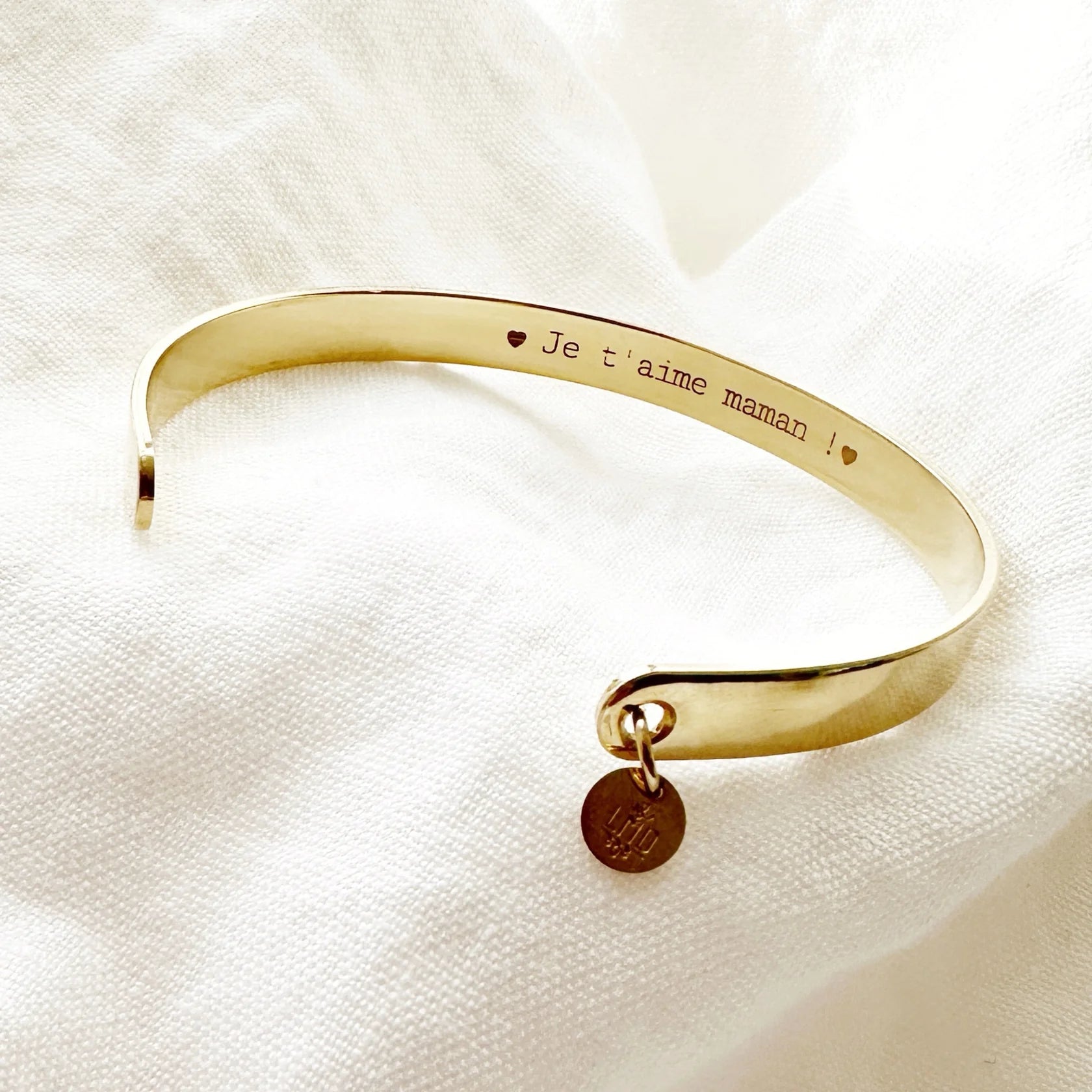 "Je t'aime maman" est gravé à l'intérieur de ce jonc entièrement fait à la main en France.