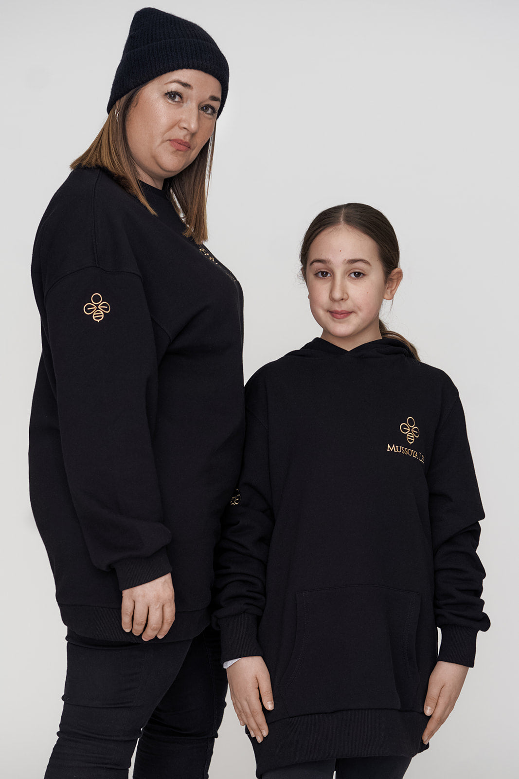 Pull tunique oversize en jersey de coton mélangé (90 % coton, 10 % polyester), offrant une excellente tenue. Il comporte des poches latérales double épaisseur, des bord‑côtes à l’encolure ronde, aux poignets et à la base, un intérieur doux et brossé, ainsi que des logos brodés à la poitrine et sur la manche droite.