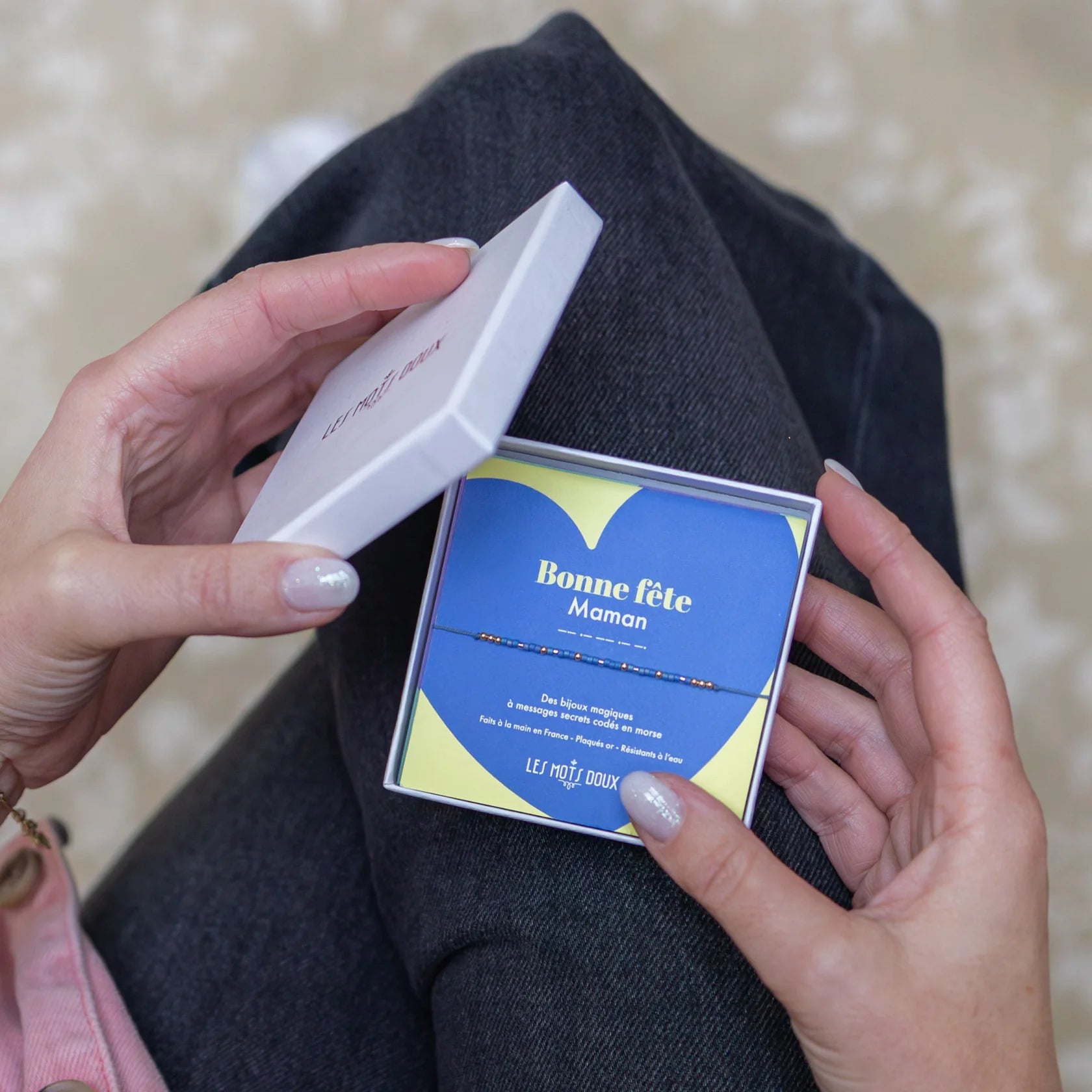 Bracelet Code Morse Bonne fête Maman (bleu et jaune)