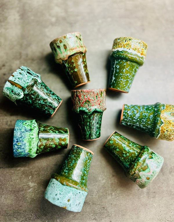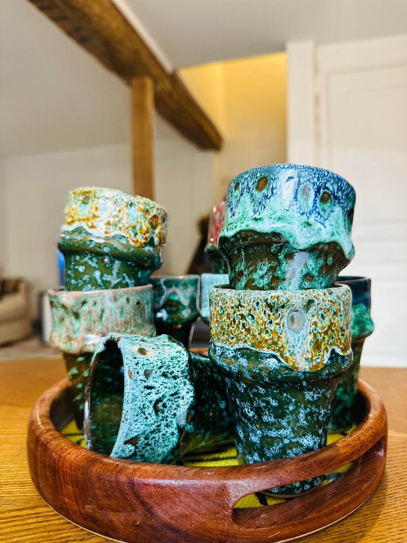 Les tasses sont des pièces uniques, entièrement faits à la main. Il est possible que des tâches apparaissent après utilisation. Pas d'inquiétude ! Ces marques disparaissent après un lavage et un séchage soigneux. Ce sont des caractéristiques naturelles de nos produits artisanaux, qui témoignent de leur authenticité.